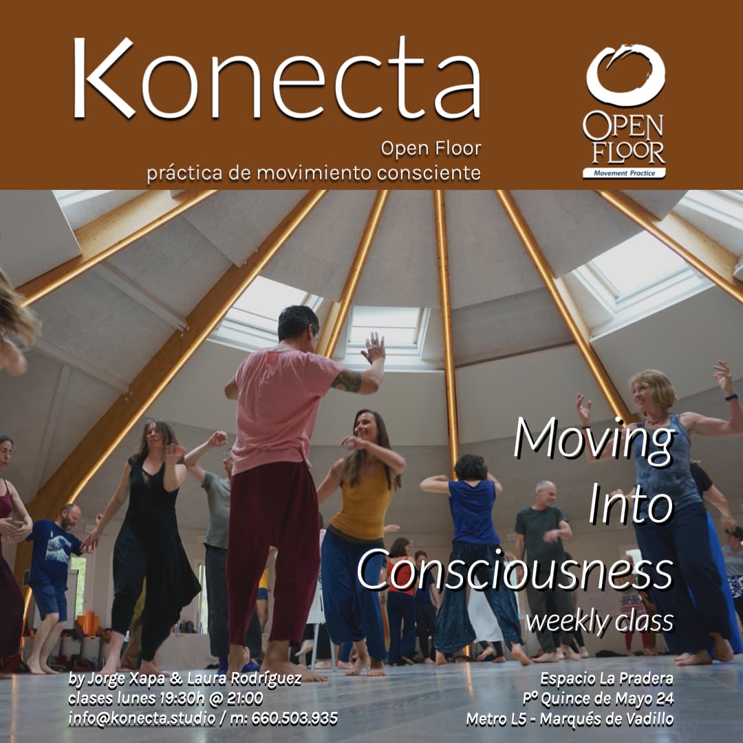 Una de nuestras líneas de trabajo somático es Moving into Consciousness, nuestra clase grupal de movimiento consciente a través de la metodología de Open Floor, que ofrece una serie de recursos que nos permiten conectar, explorar y expresar nuestro ser de forma libre y auténtica a través de la danza, la música, el arte y el mindfulness.